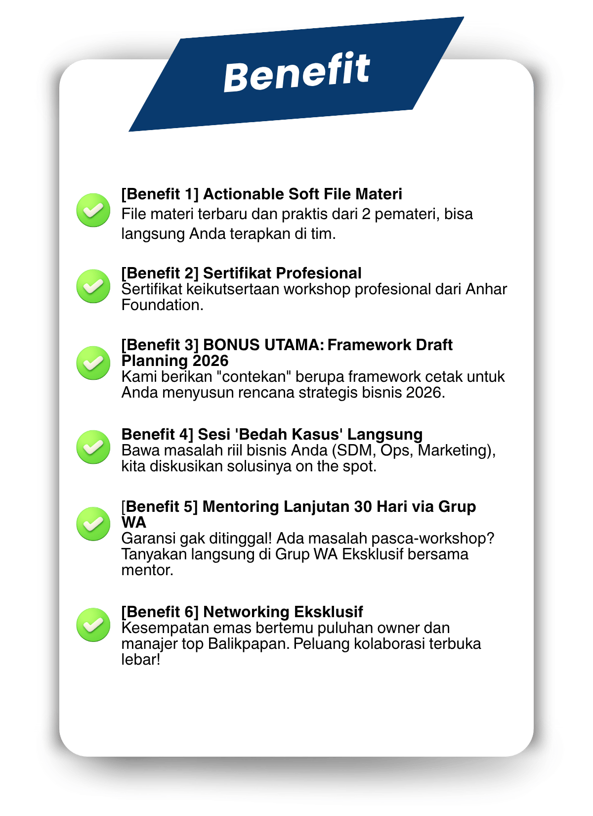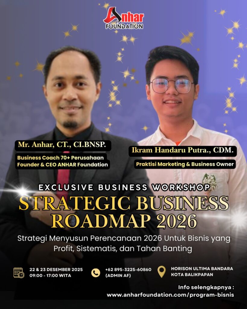 “Mr. Anhar adalah ‘arsitek’ di balik puluhan bisnis yang scale up. Beliau tidak mengajar teori, tapi best practice dari 68+ perusahaan yang telah ia bina untuk membangun Super-TEAM (SDM) dan sistem operasional anti-caur (Operasional) yang berjalan efektif.”
